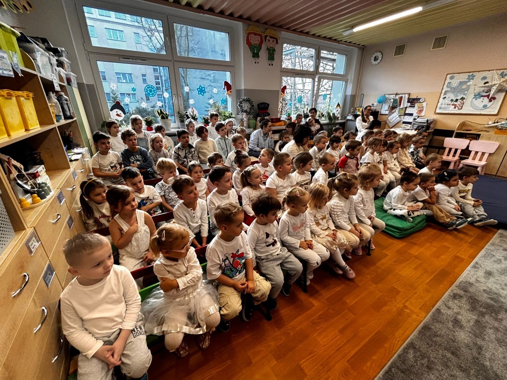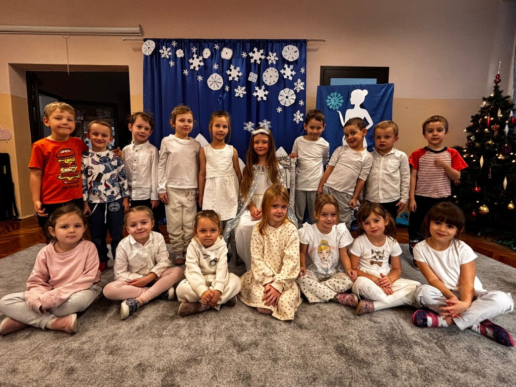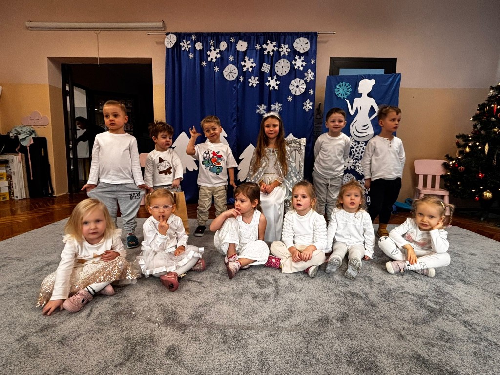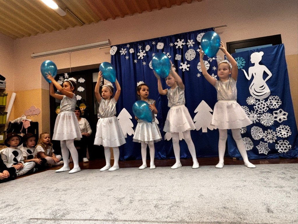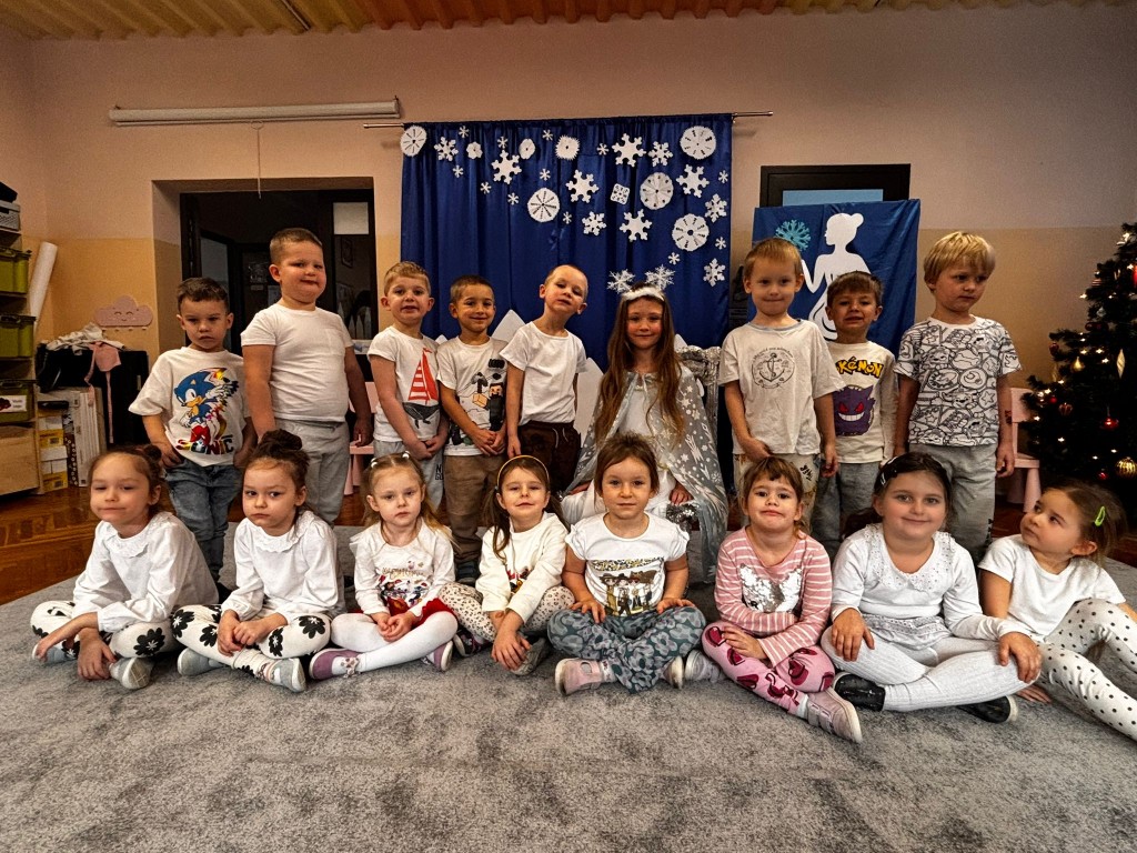 18 grudnia 2025 roku w naszym przedszkolu oficjalnie powitaliśmy ZIMĘ! Choć za oknem nie ma jeszcze śniegu, to radość z nadejścia tej magicznej pory roku była ogromna. Całe przedszkole zamieniło się w biały puch! Były wiersze, piosenki, taniec śnieżynek i taniec bałwanków. Dziękujemy za tą uroczystość pani Beacie i grupie „Jeżyki”.